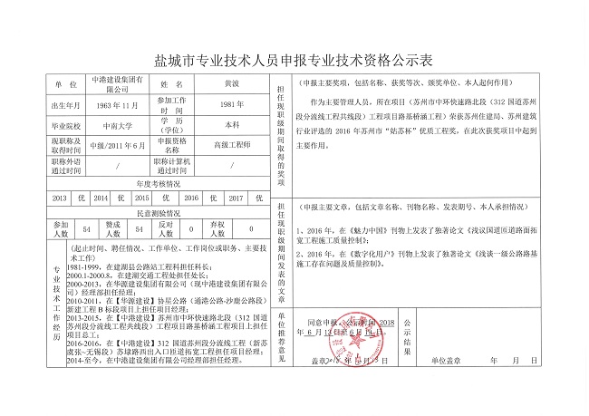 專業技術人員申報專業技術資格公示表—黃波
